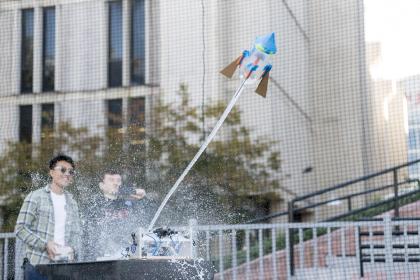 Mibrar Reza and Adam Tracy — following the spirit of Verne, von Braun, NASA and Musk — were the first-place winners of this semester's inaugural NJIT Makerspace Soda Bottle Rocket Competition, charting unexplored regions of Lubetkin Field at Mal Simon Stadium with water-powered flights of 227 and 250 feet, respectively.