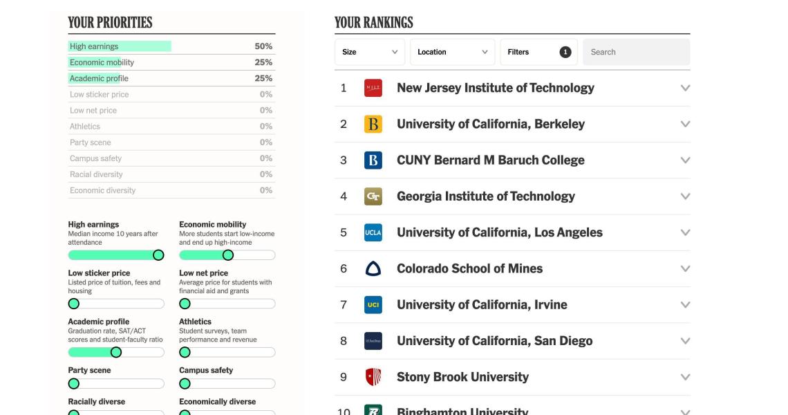 Interestingly, the NYT positions its tool in contrast to traditional rankings, where a publication produces results based on its determination of which criteria is most important. The Times tool puts that in the hands of users.